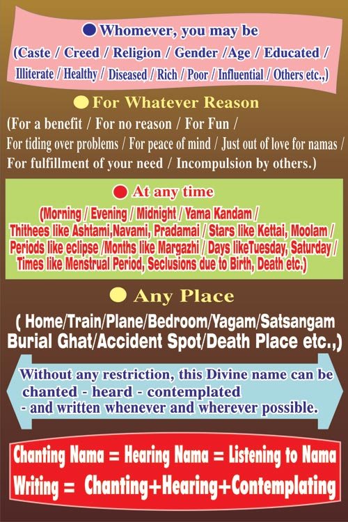 We respect, praise, worship all Nama without any discrimination. We also spread this awareness without any discrimination of country, town, city, house, and village. We spread the bhagawan nama through Yatra, Unchaviruthi, Agandam, Nama Mugaam or any means for that reason. With this as our only objective, we could reach more that 37, 00,000 devotees. We are following the path founded and practiced by the many religious gurus and saints and have the pride of being the pioneer in this great divine service. We are happy that a lot more organizations do this service.