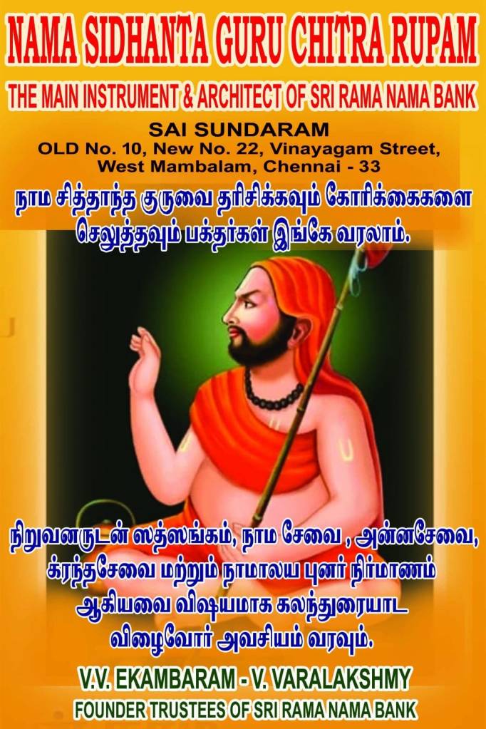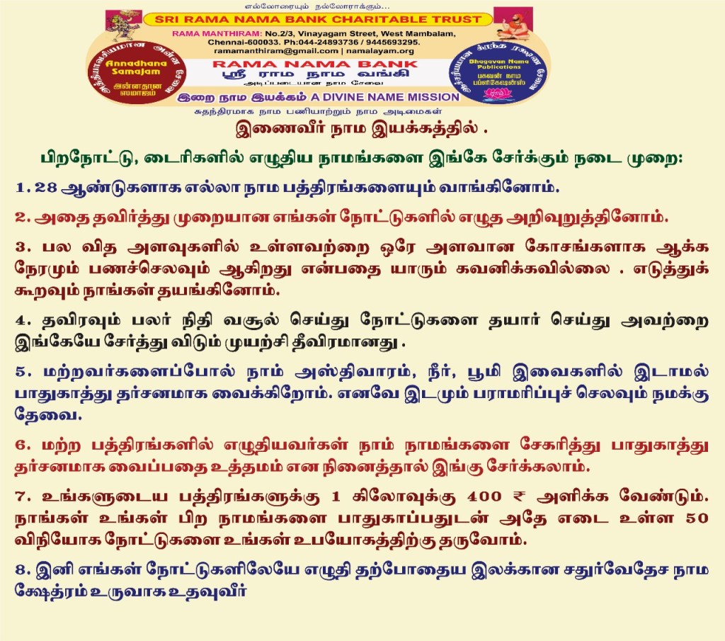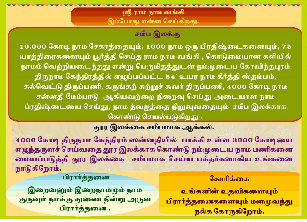 There are more than 72 lakhs distributions that have happened. This organization has been running since 15 years. More than 1,00,4600 devotees have taken part in this. More than 7220 crore Nama has been collected so far. Till now 3200 crore Namas had been installed in 103 places in India for Dharshan. Now 1008 crores of Nama is to be installed in a single place at NAMALYAM (Rama Nama Bank), Chennai. Please visit NAMALAYAM to see how your Nama is being worshipped and respected.