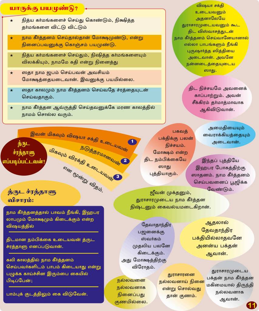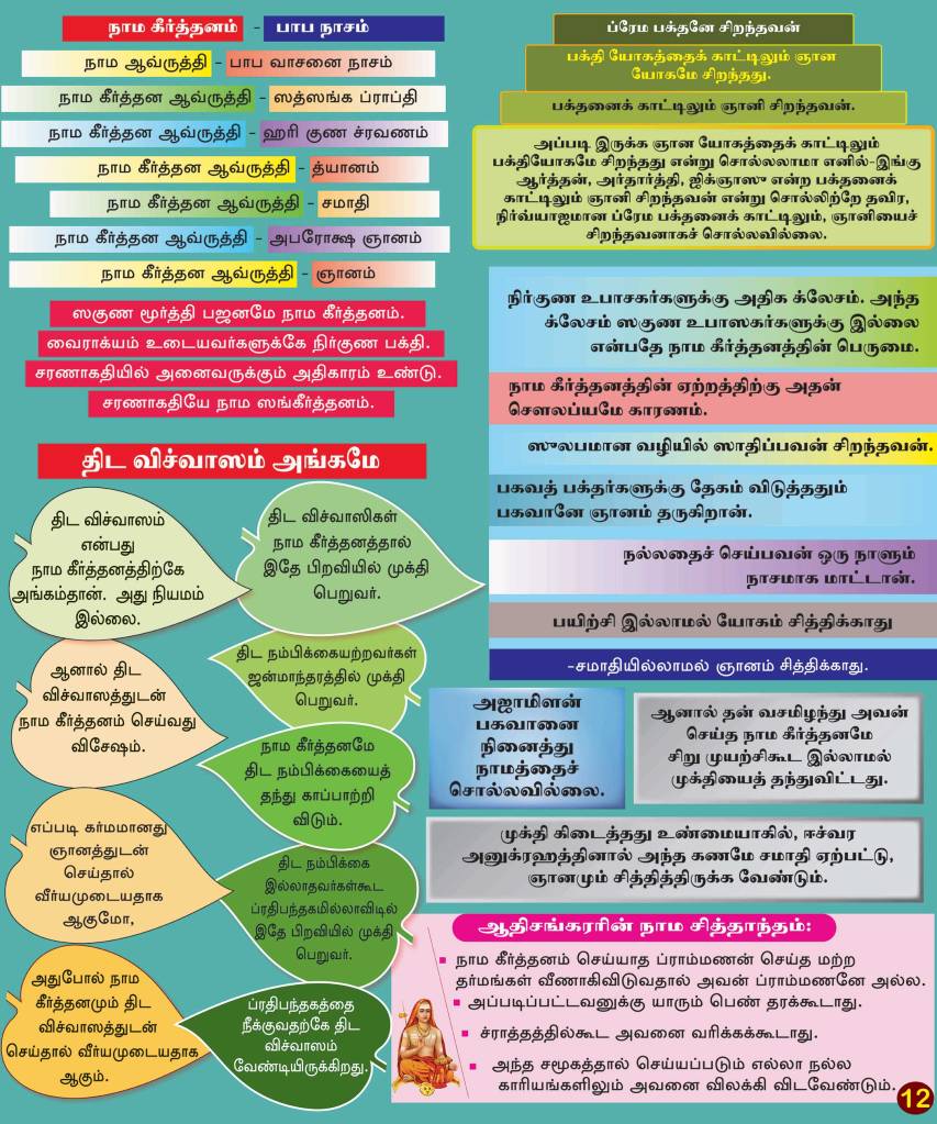 Doing punya karma’s like performing penance, learning Vedas, doing great rituals, gifting, getting dipped in holy water, performing one’s prescribed duties without fail, for thousand and thousands of birth is mere tool to get into Nama Keerthanam. They are just tools, not the ultimate fruit. Unless a rigorous penance is done in the midst of roaring fire (for unlimited kalpas), one is not destined to hear Bhagwan name at the time of death. The word kalpa stands for countless number of years. Unlimited Kalpam means Bhrama Kalpam. (<Know more about Kalpa (link) >) This does not undermine the efficacy of this penance, but it is only meant to exalt the greatness of Nama Keerthanam. It is said in ‘Poorva Mimansa’ that the punya acquired in three Bhrama Kalpam produces the love for Nama Keerthanam. If one utterance of the bhagawan nama can help one conquer the disease of birth and death what more need to say of devotees who utter the bhagawan nama with love forever. Thus the lord’s Name once uttered dispels all hurdles against Nama Keerthanam, nullifies all sins and guides the devotee to deliverance. Karma yoga is prescribed for those who do not set interest in Nama Keerthanam and its greatness. So one has to perform dedicated Karma Yoga for 3 Bhramma kalpa to get interest in Nama Keerthanam. Nama Keerthanam is called Saguna Bhrama Bhajanam. This makes one as a potential candidate for Nirguna Bhrama Nishta which is the tool for attaining gnana. So Nama Keerthanam is for attaining gnana There is no other way but to chant His name. It strengthens your faith, purifies your soul. The mind is a wanderer, only God’s name can give it a direction. Sincere love leads to concentrated devotion; continual chanting of God’s name fills our soul with concentrated devotion through this one can attain God. “God’s name on lips, salvation in hand” that is the experience of many. Meditation brings one untold gain; the chanting of God’s name.