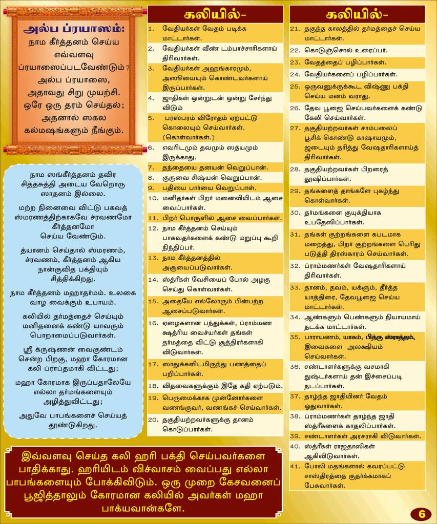 When Dharma staggers on one leg and retegeted to a corner… When all unrighteous actions gain the upper hand… When men and women abandon all prescribed commandments and rules… An easy path, the path that is simple and effortless and suited for all human beings in Kali Yuga comes to rescue and deliverance of one and all. It is the recital of Bhagwan Nama. Understanding the helpless state of human being, Bhagwan enforced that in Kali Yuga, Nama Sankeerthanam is the only way to salvation. It is said in Vishnu purana…